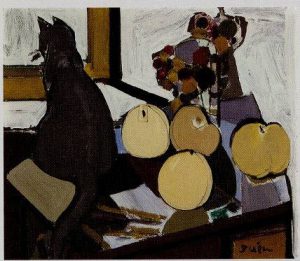猪熊弦一郎の描く猫はとても表情豊かで、愛嬌に満ちています。描かれる猫は机の上や人の肩、頭の上に乗っています。猫の自由奔放な姿に純粋さを感じていたのかもしれません。《猫によせる歌》や《ふたりの裸婦と猫》といった作品にはフォーヴィスムやキュビズムなどの影響が感じられます。