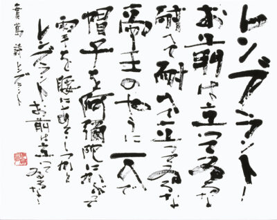 有名な作品に《北原白秋詩『海雀』》や《武者小路実篤詩 レンブラント》があります。どちらも当時の作家の詩を引用し、字と仮名を調和させて書いた作品です。