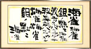 今では当たり前のように親しまれている漢字仮名交じり文ですが、昔は書は漢字だけで構成されるものでした。金子鷗亭は主に近代の文学を題材に、漢字とかな、カタカナを混ぜて調和させた書を書き続けました。それは書をより多くの人に広めるためでもあり、その時代にはその時代の書が必要であるといった考えに基づくものでもありました。