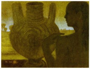 1950年代から70年代にかけて、高山辰雄は「人間の存在と精神性」をテーマに、人物画や宗教的モチーフを多く描きました。 代表作「行人」や「少女」などに見られるように、人物表現を通して「生きるとはなにか」「人間の本質とはなにか」と問いかけるような作品を展開します。その画面は淡い色彩と静謐な構成により、精神的深みを漂わせています。