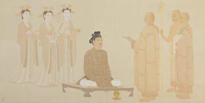 「夢殿」は1912年第六回文展にて二等賞を受賞した作品です。聖徳太子が夢殿で瞑想していると、金色に輝く僧が現れ教えを授けたという伝説によるもので、神秘的な世界を明澄な色彩で描き、それまでの線的な画風から脱した作品です。後年完成をみる高雅な絵画世界に踏み出した記念碑的作品と言われています。